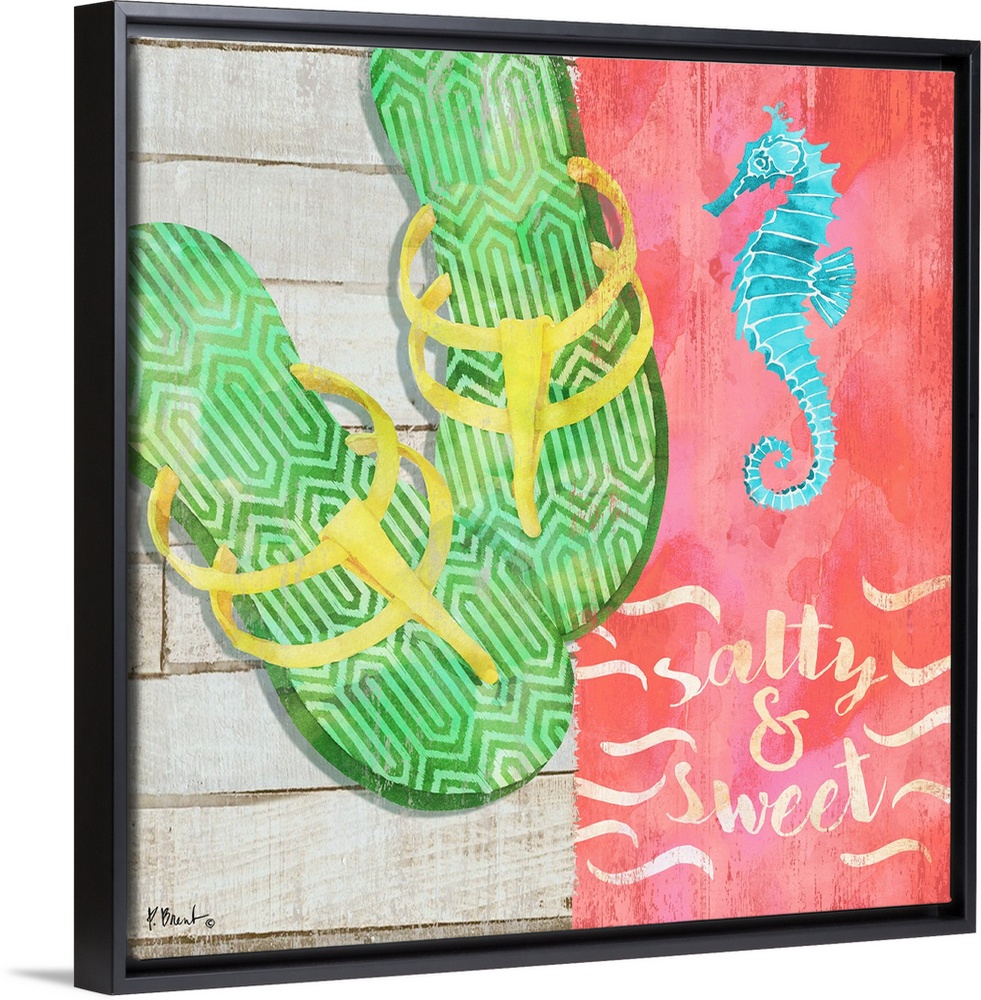 <p>Square Summer decor with flip flops, a seahorse, and "salty and sweet" written at the bottom.</p>