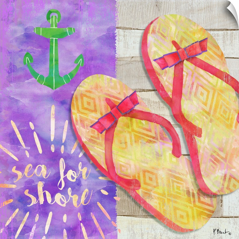 <p>Square Summer decor with flip flops, an anchor, and "sea for shore" written at the bottom.</p>