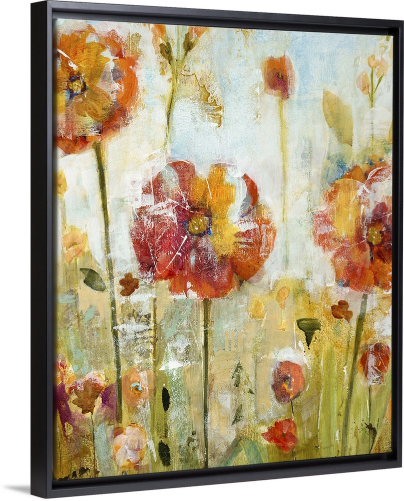 <p>Contemporary painting of pale red and orange wildflowers.</p>