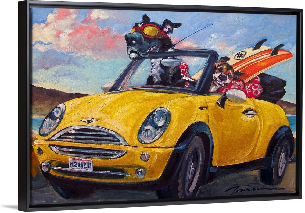 <p>Thick brush strokes create a humorous scene of dogs riding in a sporty car.</p>