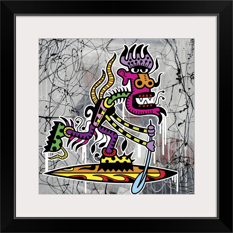<p>Contemporary painting of a colorful and decorative monster paddle boarding, against an abstract background.</p>