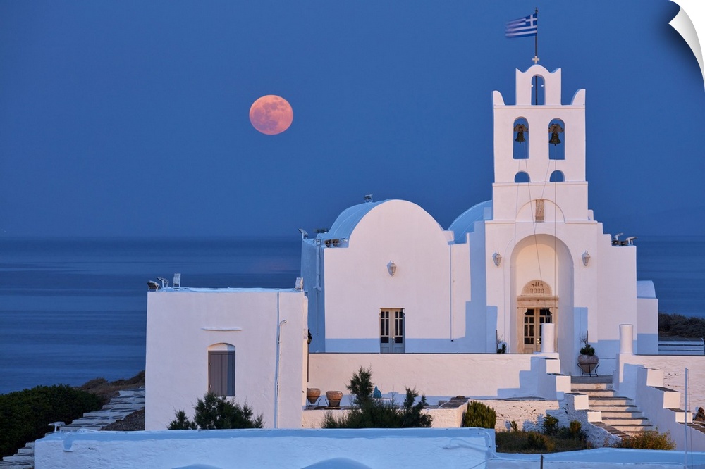 <p>Super moon rising behind Chrisopigi Monastery on Sifnos island at dusk, Cyclades, Greek Islands, Greece, Europe</p>