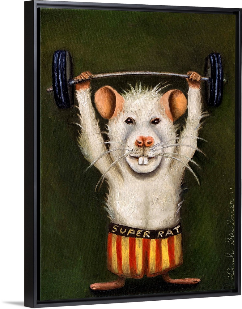 <p>Surrealist painting of a white rat lifting a dumbbell.</p>