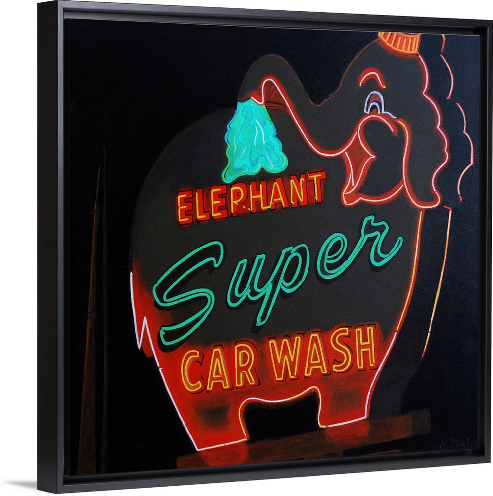 <p>Fine art oil painting of a vintage neon super car wash elephant set against a dark background by Heidi Martin.</p>