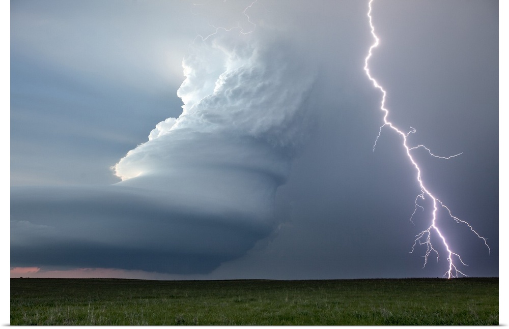 <p>Supercell thunderstorm and lightning strike over rural Nebraska, USA. A supercell thunderstorm is a severe long-lived storm within which the wind speed and direction changes with height. This produces a strong rotating updraft of warm air, known as a mesocyclone, and a separate downdraft of cold air. Tornadoes may form in the mesocyclone, in which case the storm is classified as a tornadic supercell thunderstorm. The storms also produce torrential rain and hail. Photographed on 26 May 2013, in central Nebraska, USA.</p>