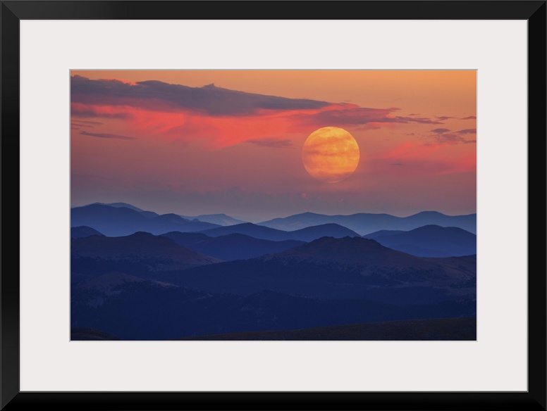 <p>A glowing moon at dawn over misty mountains.</p>