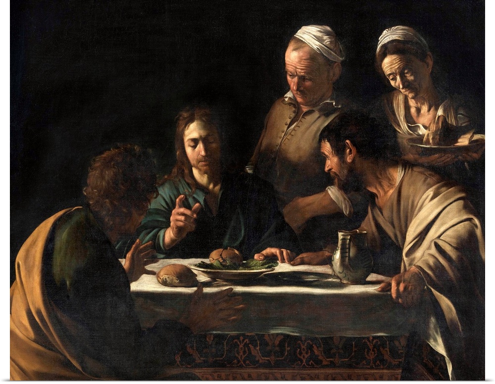 <p>The Supper at Emmaus, by Michelangelo Merisi known as Caravaggio, 1606 about, 17th Century, oil on canvas, cm 141 x 175 - Italy, Lombardy, Milan, Brera Art Gallery. All. Supper guests Jesus Christ blessing laid set table loaf of bread jug pitcher plate di</p>
