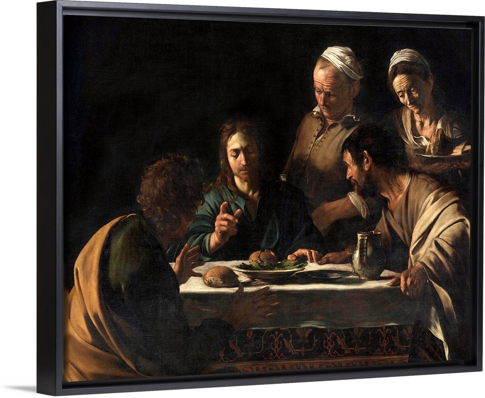 <p>The Supper at Emmaus, by Michelangelo Merisi known as Caravaggio, 1606 about, 17th Century, oil on canvas, cm 141 x 175 - Italy, Lombardy, Milan, Brera Art Gallery. All. Supper guests Jesus Christ blessing laid set table loaf of bread jug pitcher plate di</p>