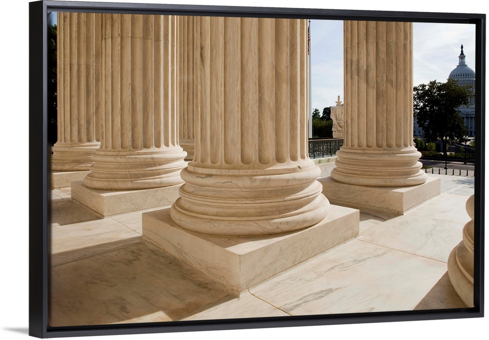 <p>USA, District of Columbia, Washington, DC, Columns at entrance to Supreme Court Building and Capitol Building in distance.</p>