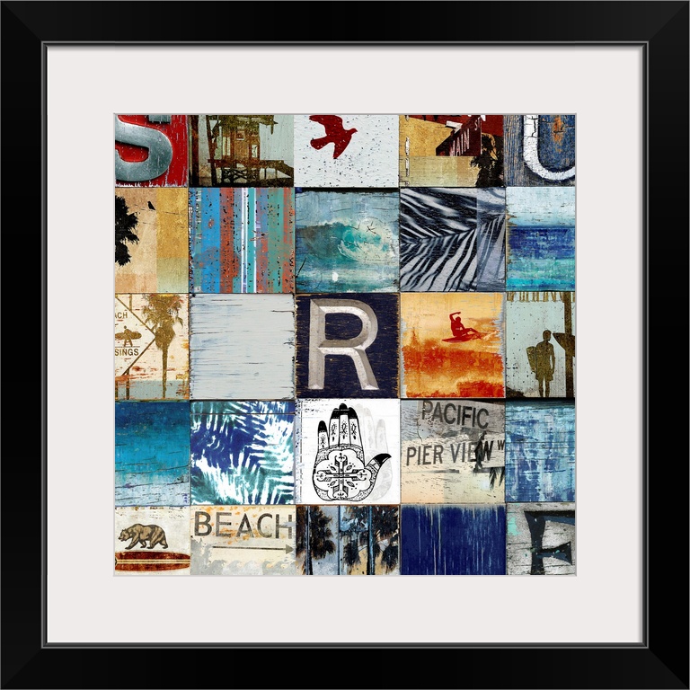 <p>25 beach themed squares in rows with 4 squares having a letter to spell out "Surf"</p>