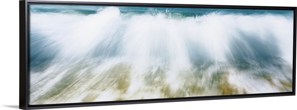 <p>Up-close panoramic photograph of wave crashing onto beach creating spray.</p>
