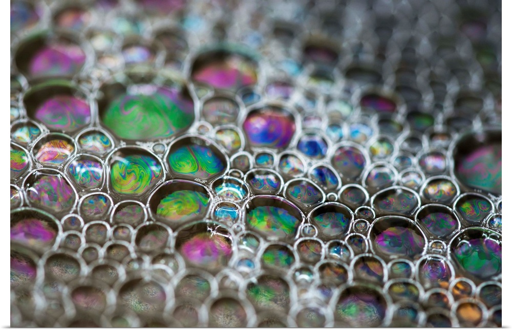 <p>Surf leaves colourful bubbles on the beach; Cannon Beach, Oregon, United States of America</p>