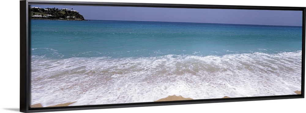 <p>Panoramic image of waves washing ashore from a crystal clear ocean.</p>