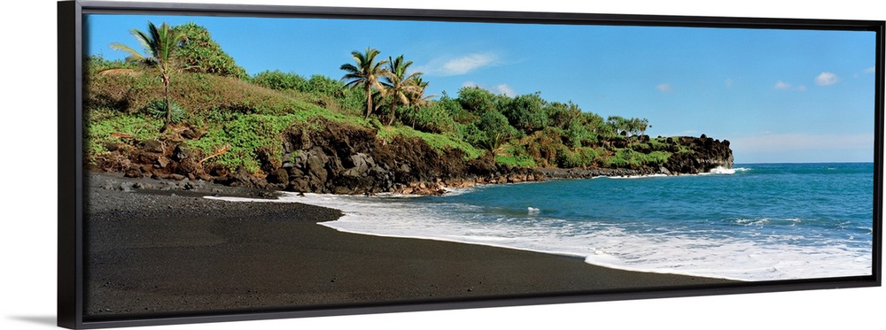 <p>Panoramic photograph displays the waves of the Pacific Ocean gently crashing into the sandy shores of an island. Towards the end of the sand, a tropical landscape filled with palm trees and lush vegetation can be seen making its way into the distance.</p>