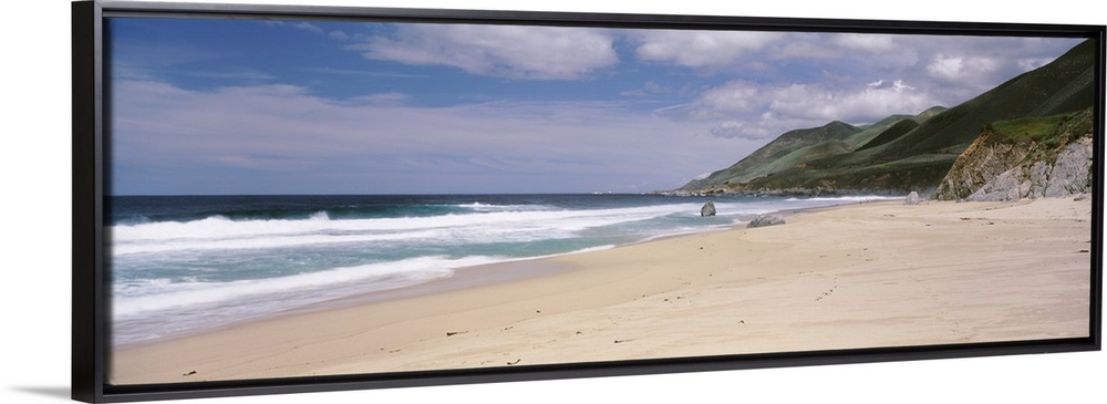 <p>Panoramic photograph of shoreline with mountains. There are waves rolling in under a cloudy sky.</p>