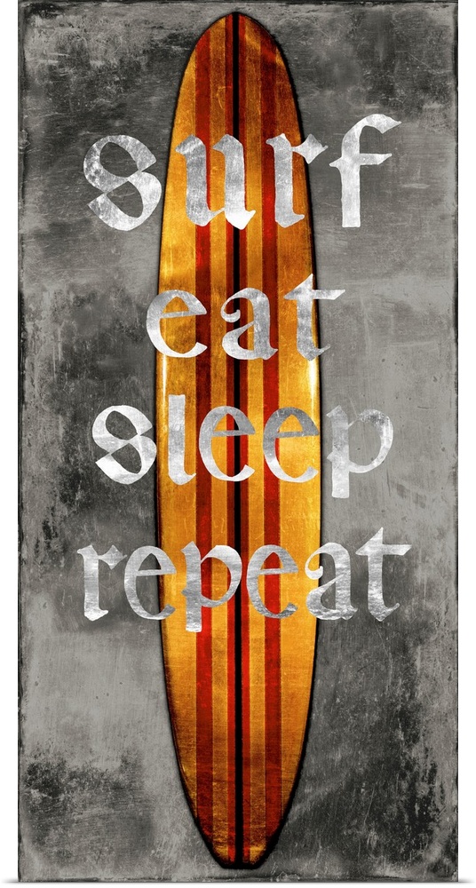 <p>Beach themed illustration of a red and yellow striped surf board on a faded black and gray background with "pray for surf" written over the top.</p>