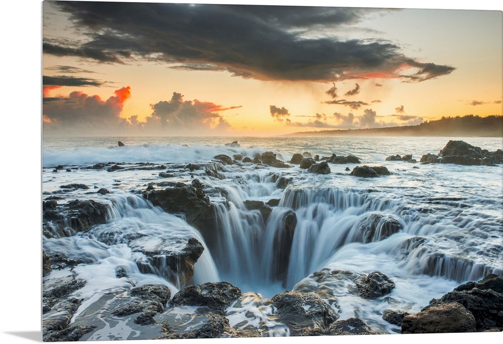 <p>Surf spills into a hole in a rock outcrop on the east side of Kauai. Kauai, Hawaii, United States of America.</p>