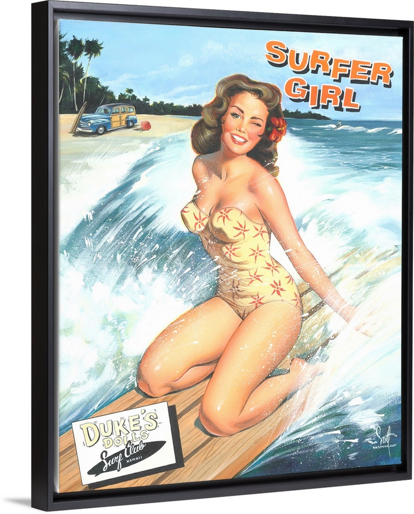 His clearly recognizable images of Hawaii beaches and flowers go alongside iconic surfing art featuring woodie cars, flip flops, surfboards and whimsical dogs.