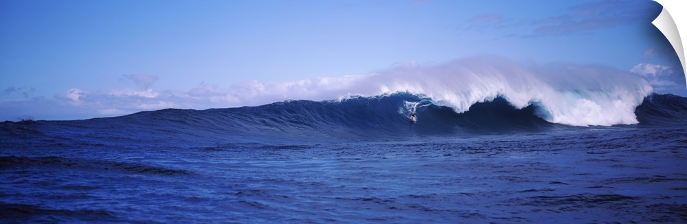 <p>Panoramic image of a surfer riding a large breaking wave.</p>