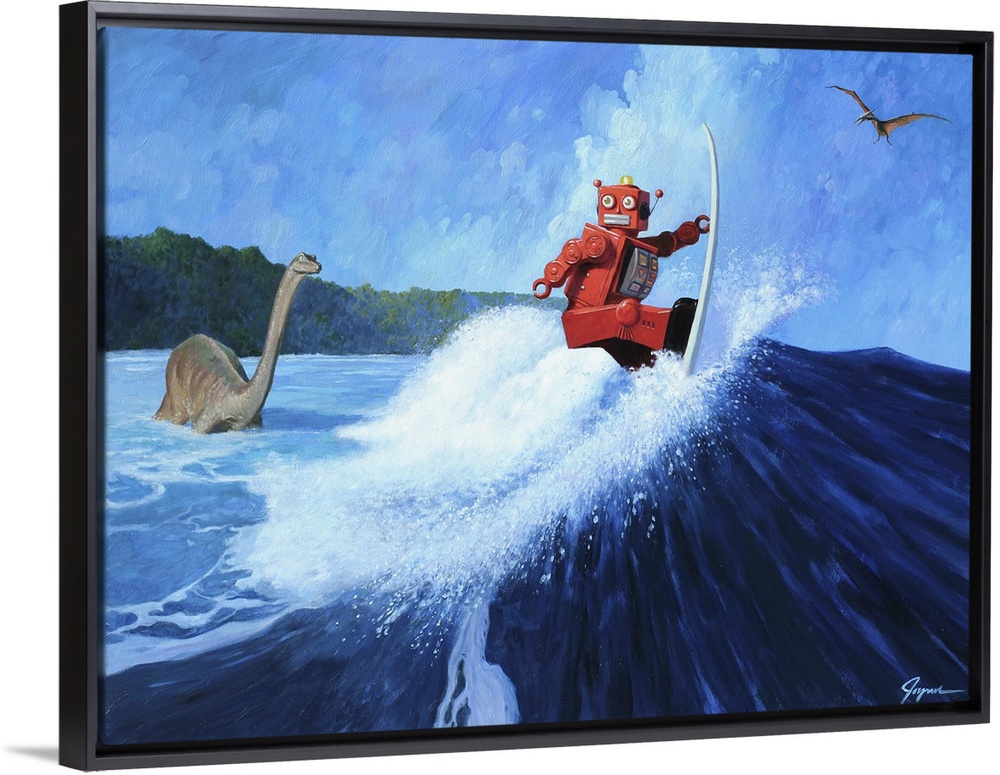 <p>A contemporary painting of a red retro toy robot surfing a giant wave while dinosaurs are seen in the background.</p>