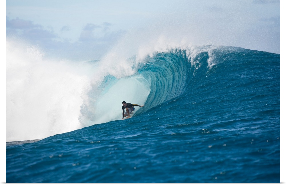 <p>Surfer surfing wave in Pacific Ocean, Moorea, Tahiti, French Polynesia</p>