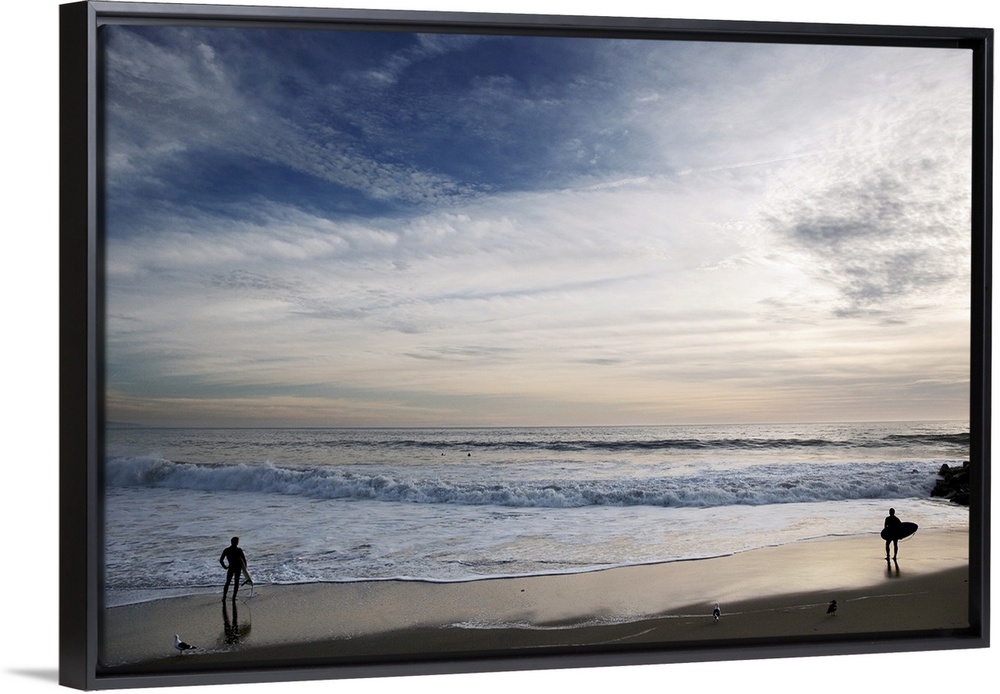 <p>Huge photograph displays a couple individuals with surfboards standing on the edge of the ocean and watching the waves crash into shore.</p>