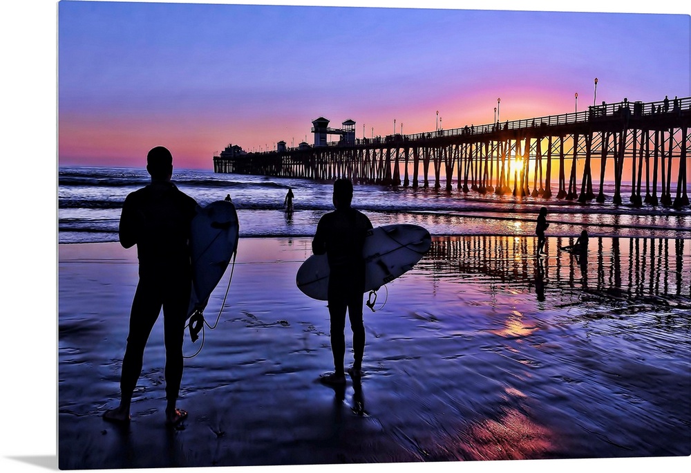 <p>Surfers at sunset near the iconic Oceanside Pier. Oceanside is 35 miles North of San Diego, California, USA.</p>
