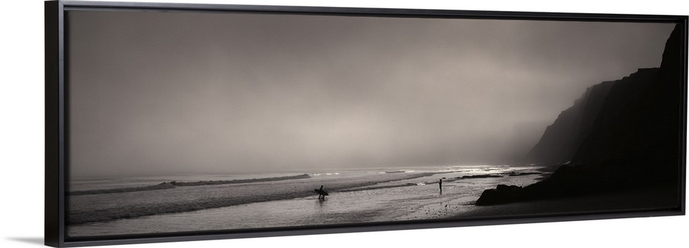 <p>Panoramic photograph on a giant canvas of a dark, foggy sky over Point Reyes National Seashore, where two surfers walk away from the water toward a large cliff.</p>