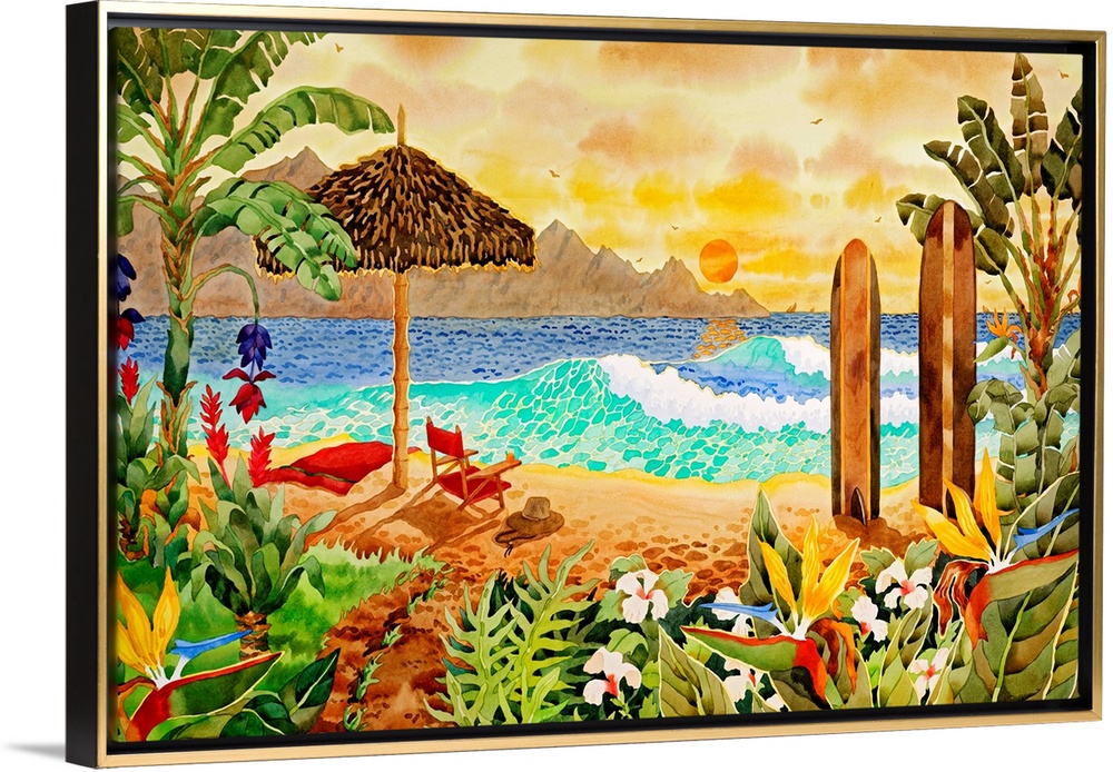 <p>Giant contemporary art displays a lively beach scene filled with lush vegetation and an umbrella and chair sitting next to a couple surf boards in the sand. The backdrop of this piece includes the brightly shining sun sitting above a rocky mountain range and overlooking the ocean as it breaks onto shore.</p>