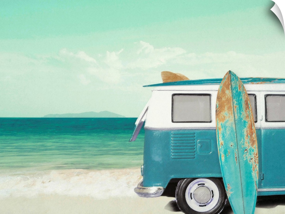 <p>Beach themed decor with an illustration of a white and blue vintage VW van with a surf board leaning up against it on the shore.</p>
