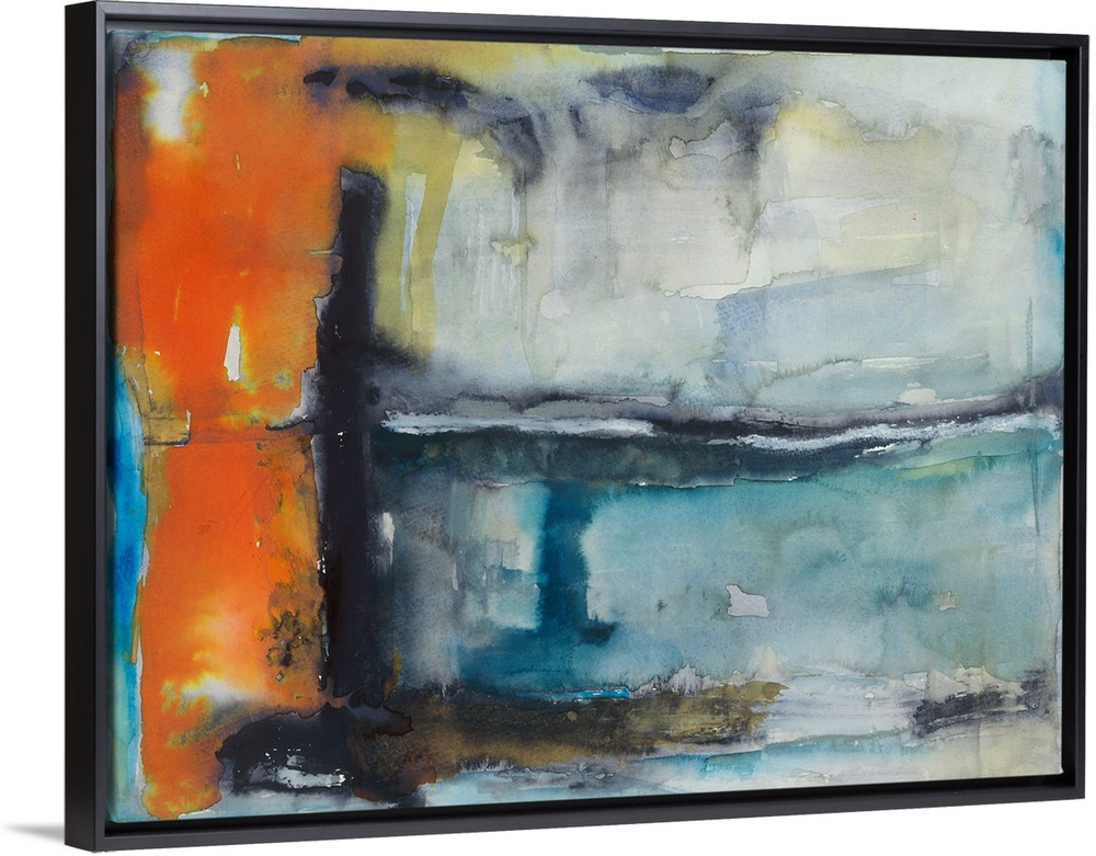 <p>Abstract painting made with orange, yellow, gray, and shades of blue.</p>