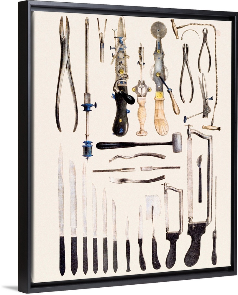 <p>Surgical instruments for use on bones, historical anatomical artwork. This 19th century textbook illustration shows different instruments used to perform surgery on bones. The large knives and saws (lower) were used for cutting through bone during amputation, the smaller knives and scalpels for cutting softer tissues. At the top can be seen several mechanical saws, including a chainsaw, for cutting bone, and various shears, scissors and forceps. This illustration is taken from the 19th century French textbook The Atlas of Human Anatomy and Surgery by J. M. Bourgery and N. H. Jacob.</p>