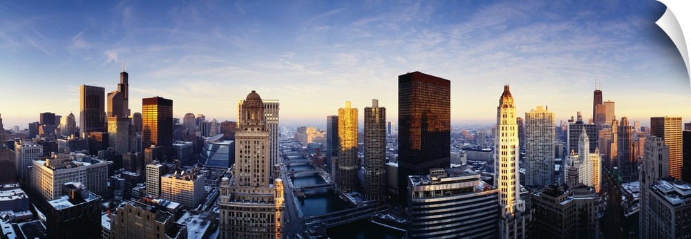 <p>Expansive panoramic photograph of the early morning sunrise over Chicago, Illinois (IL) landscape. The Chicago river, large and small buildings, and skyscrapers are visible as the sun begins to break and the sun's rays begin to touch the structures.</p>