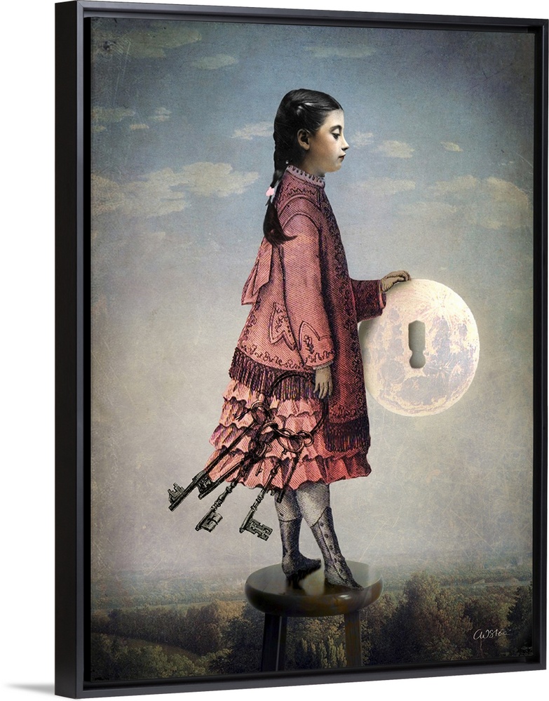 <p>A young girl is holding the moon with a key hole in it and a ring of keys.</p>