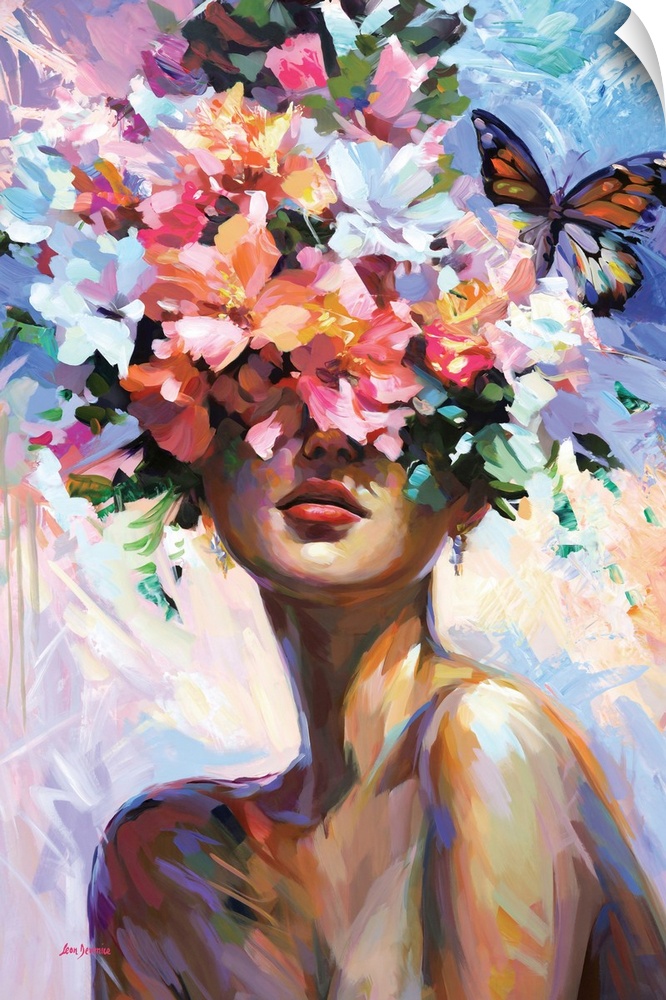 <p>The contemporary artwork portrays a woman with her face covered by vibrant flowers, surrounded by expressive brushstrokes of warm colors and a nearby butterfly, creating a dreamy and natural atmosphere.</p>