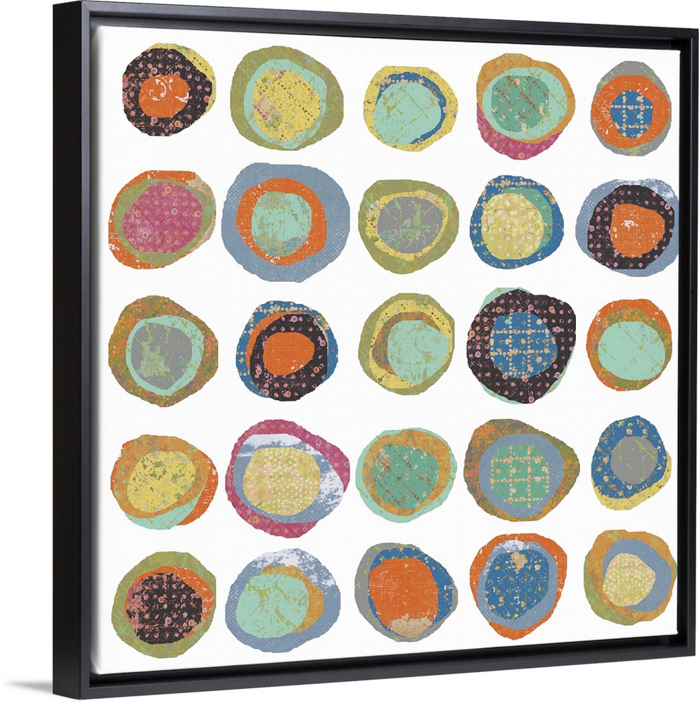 <p>This dotted landscape was created from a series of patterns that digitally cut up into circles and then layered with a variety of colors and shapes. Piece can go very large and would work well for lobby, game room and hospitality.</p>