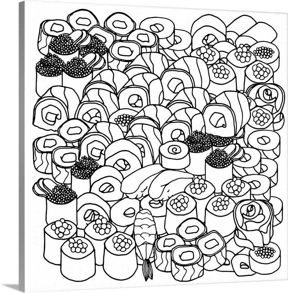 <p>Contemporary line art of a large group of sushi rolls with sashimi against a white background. Perfect for Coloring Canvas.</p>