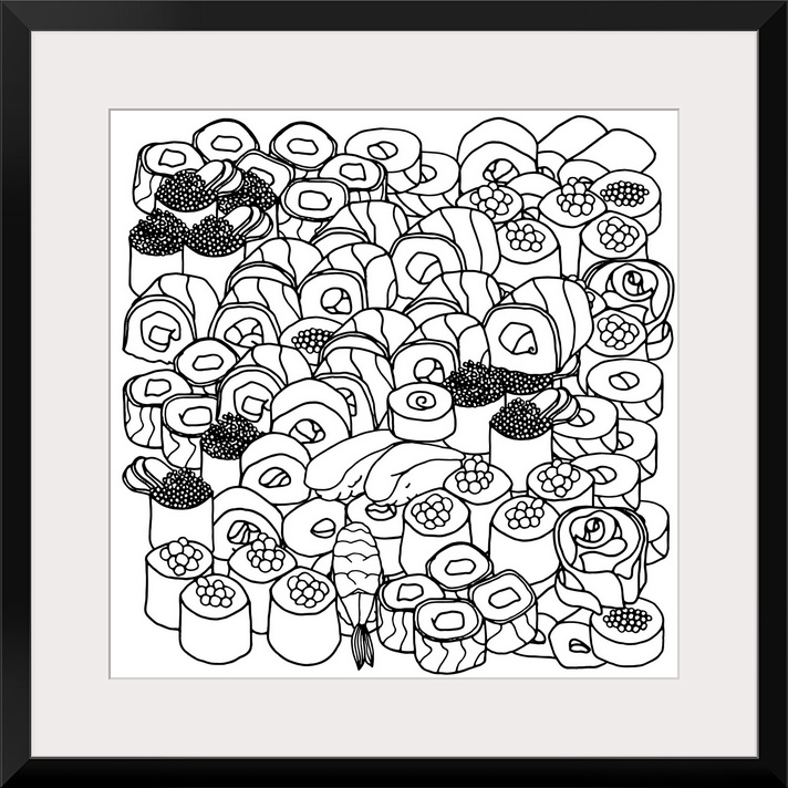 <p>Contemporary line art of a large group of sushi rolls with sashimi against a white background. Perfect for Coloring Canvas.</p>