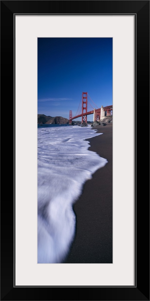 <p>Large, vertical photograph looking down the shoreline of the San Francisco Bay, the Golden Gate Bridge in the background beneath a deep blue sky, in San Francisco, California.</p>