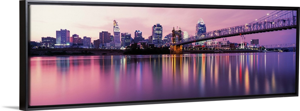 <p>Suspension bridge across the Ohio River with skyscrapers in the background, Cincinnati, Ohio, USA.</p>