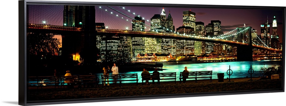 <p>Manhattan lights reflecting in the East River under the Brooklyn bridge while people sit on benches watching the view.</p>