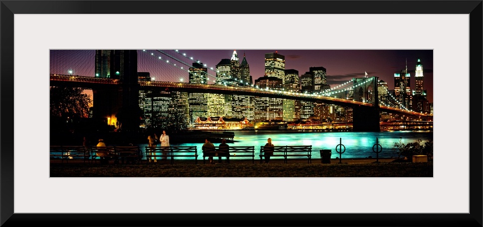 <p>Manhattan lights reflecting in the East River under the Brooklyn bridge while people sit on benches watching the view.</p>