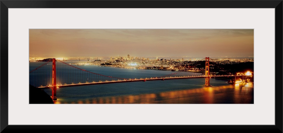 <p>Panoramic photograph shows the bright lights of the Golden Gate bridge as they reflect onto the water below. The vivid colors of the city in the background can be seen for miles on this clear night.</p>