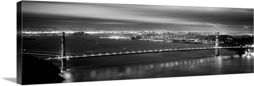 Suspension bridge lit up at dusk, Golden Gate Bridge, San Francisco, California
