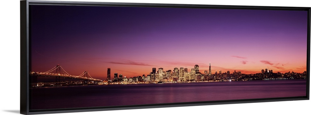 <p>Dusk panoramic photo looking across the San Francisco Bay at the buildings lit up in downtown San Francisco and the Bay Bridge looming over the water.</p>