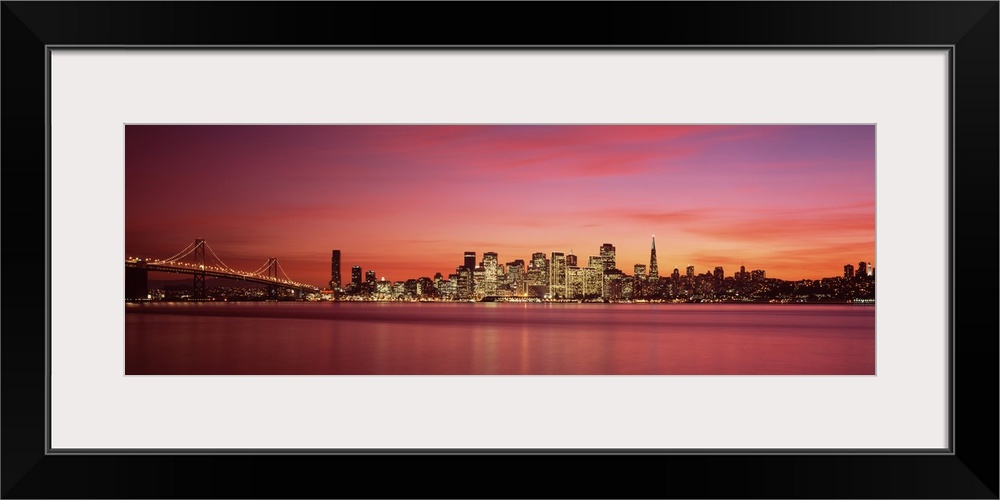 <p>Cityscape in the evening with lights on the skyscrapers as the sunlight fades away with wispy pink clouds and the blurred water of the Bay.</p>