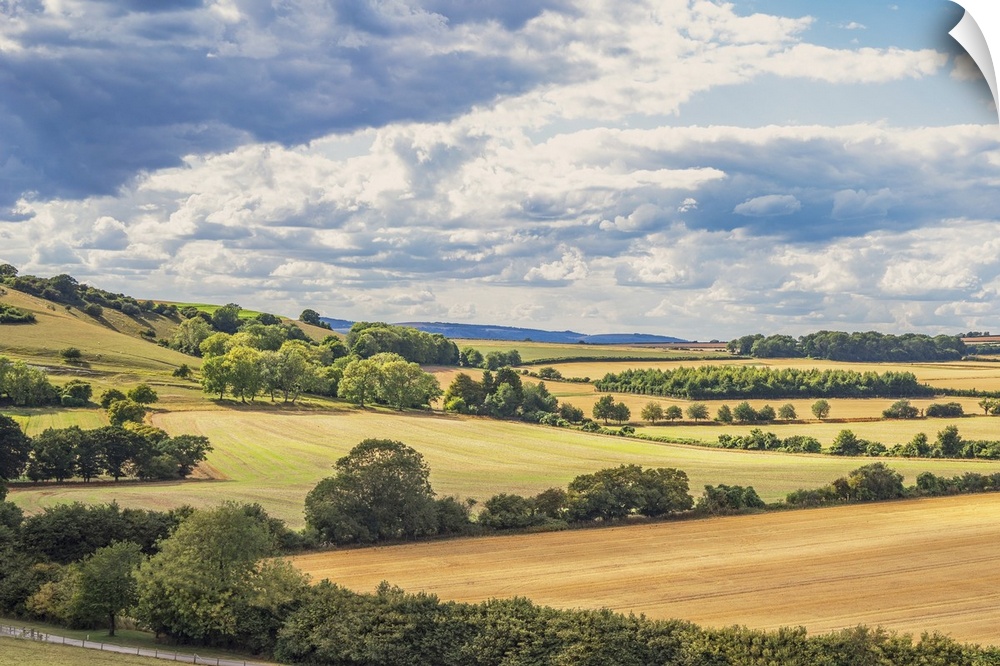 <p>large fields on the South Downs in Sussex, England, UK on a summers evening during harvest.</p>
