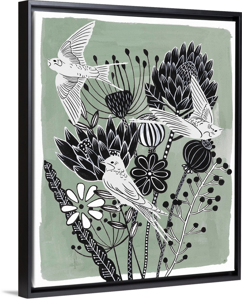 Art Mint and Pale Grey Cottagecore Decorative Art Florals Green Wall Art Mint Green Painting Melissa Wang Wildlife Bird