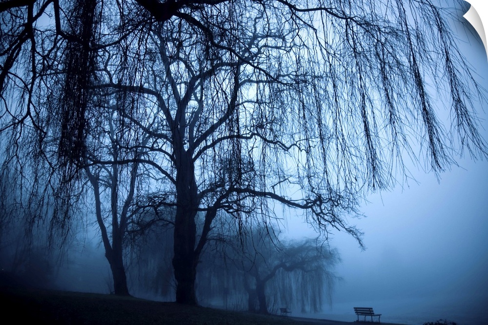 <p>Two benched and weeping willow trees in the fog at Lost Lagoon.</p>