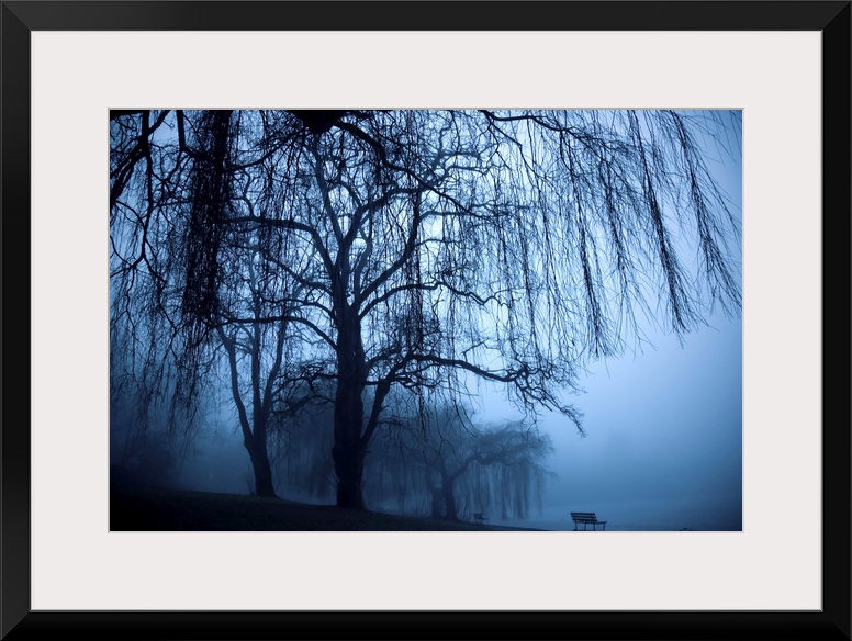 <p>Two benched and weeping willow trees in the fog at Lost Lagoon.</p>